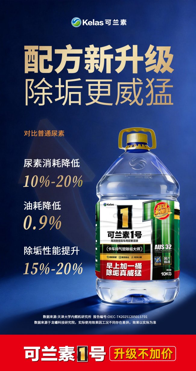 作为连续两届斩获“年度值得用户信赖车用尿素”的明星产品,可兰素1号升级款在省油降耗、除垢性能上实现全面突破。升级款新增全新裂解催化因子,除垢性能较前代提升15%,能精准裂解后处理系统的顽固结垢,深度清洁SCR系统,从根源避免喷嘴、尿素泵堵塞问题,减少车辆维修频次,让卡友省去高额维修开支,出行更省心,彻底解决卡友常年困扰的后处理故障难题。